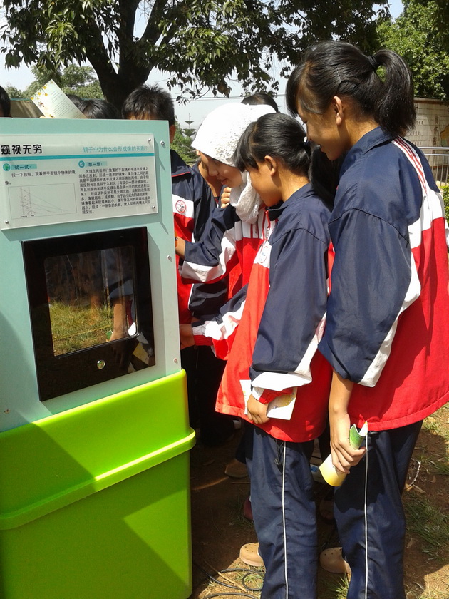 同学动手观看科普仪器