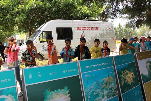 本次活动,除了给同学们带去大篷车已有的25件互动体验式科普车载展品,3件36块主题为“远古恐龙·海洋世界”的3D立体科普宣传展板外,还为广大师生准备了科普知识有奖现场竞答和环保科普知识讲座,其他参与单位带去的有关环保、卫生、食品安全等科普知识展板展出和科普挂图。免费向学校赠送了专门针对中小学生设计的,涉及科学常识、食品安全、医疗卫生、防灾减震等方面的科普书籍500册和宣传资料400余份,为该校400名师生送去了“科学营养餐”。活动中,该校校长和部分教师紧紧抓住这个机会,以“手蓄电池”、“梵天之塔”、“镜面成像”“看谁跑得快”等展品展具,现场为五、六年级的学生上了一堂生动而有效的数学课、物理课。3D展板的呈现更是让学生们惊奇,通过观看学习其中的内涵,使全校师生形成人人崇尚科学、学科学、爱科学的良好氛围,学生们兴趣浓厚,热情参与,许多学生边看边操作体验,奇妙的科学现象让大家不时发出阵阵惊叹。山区的孩子们也能亲自体验到科技带来的乐趣和魅力,增长了见识,开阔了眼界。