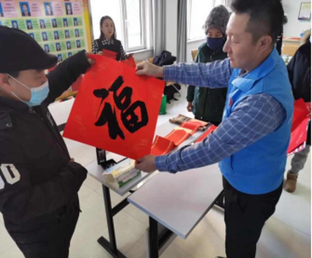 接着到场的书法家们挥舞着手中蘸满清香浓墨的毛笔,在红色龙凤春联纸上写下一幅幅与科普相关的春联和福字,赠送给社区居民,红色的春联和热闹的人群将活动现场映衬得年味十足。活动现场共写出了春联200余副,180副福字,根据疫情防控要求 ,控制现场社区居民们人数,活动结束后社区工作人员将写好的春联福字和科普图书送到居民家中,把“福”送到家,让居民深刻感受到中华民族优秀统文化魅力和来自科普志愿者们的新年祝福。