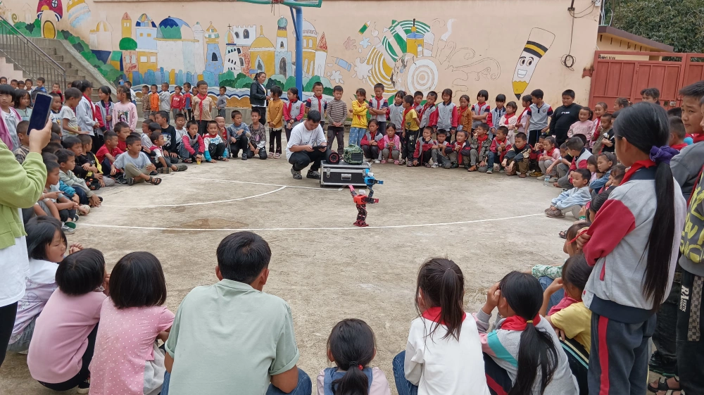 每到一所学校,科普大篷车刚站稳脚学生们就迫不及待的赶了过来,随着大篷车车门的打开,一列列整齐的展板便呈现在了眼前,但最引人注目的还是一个装有两个“技艺超群”的机器人的箱子,学生们团团围住箱子,等待着开箱惊喜。当所有展板都摆放整齐后,机器人“小宁”“小萌”闪亮登场,它们唱着“跟着我左手右手一起慢动作”,跳着酷炫的舞蹈,引得同学们随“机”起舞,收获一阵阵的掌声和欢呼声。