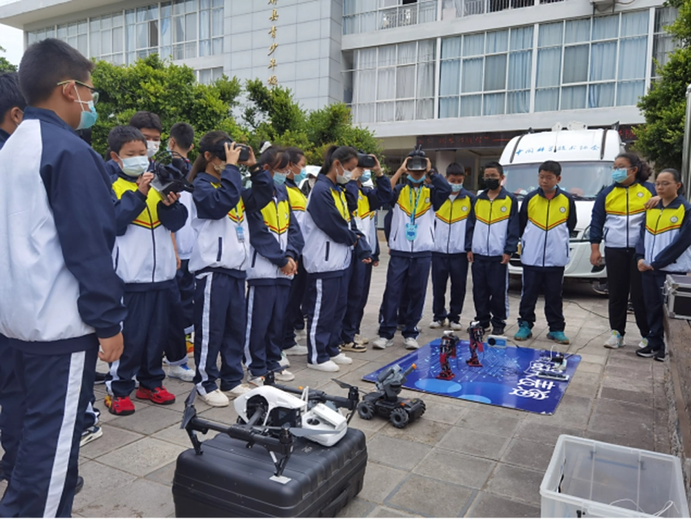 在活动现场,科普志愿者们组织学生体验科普教具、向学生们展示机器人、无人机表演、机甲大师对抗赛等,指导同学们亲自上手操作设备做出各式各样的动作;戴上VR眼镜,同学们沉浸其中,跟着虚拟的场景“东倒西歪”,引得围观的学生跃跃欲试、纷纷加入到活动中来;工作人员还在现场发放科普宣传资料、布放宣传展板、播放车载电视等,向大家科普宣传了预防溺水、食品安全等方面知识。