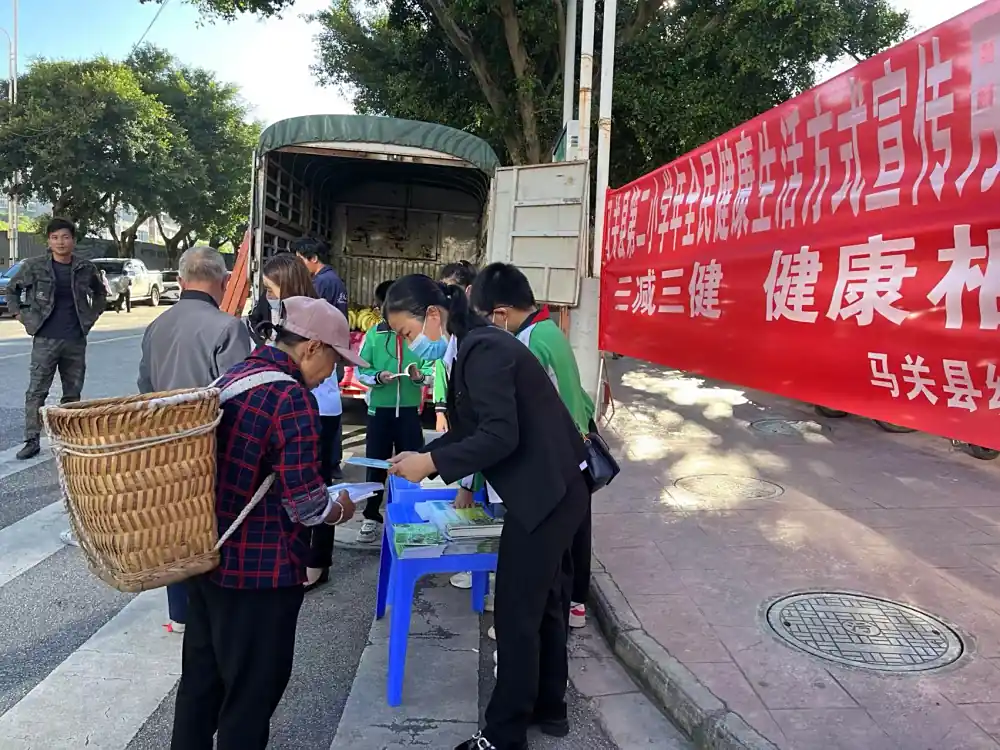 活动现场悬挂横幅,设立咨询台,向来赶集的过往群众发放宣传资料,讲解“三减三键”、科学健身等健康科普知识。科普大篷车播放三减三健、健身方法等科普视频资料。