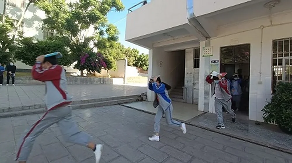 在防震演练环节,随着地震警报响起,各位老师迅速作出反应,立即组织学生迅速抱头,蜷曲身体,降低身体重心,就近避险。
