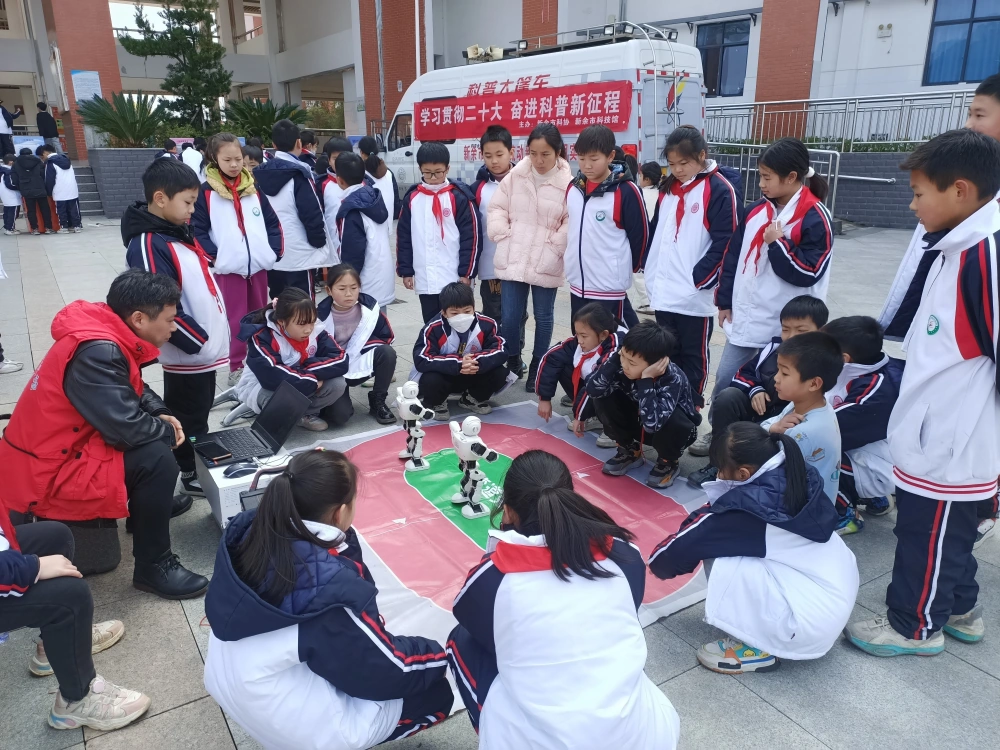 科普大篷车带来近20件涉及声、光、电、数学、生命科学等学科知识的科教展品,无人机飞行表演,VR体验,机器人、机器狗等把整个活动现场变成了科普游乐园,让同学们在趣味体验与互动游戏中感受科技的魅力。