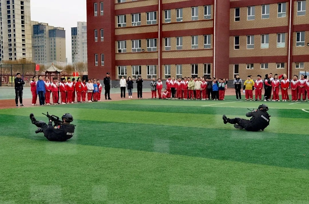 反恐大队队员结合校园实际,在校园操场上现场演示了战术动作、抓捕网、使用无人机侦查技术,让同学们对反恐防暴知识有了直观清晰的认识。