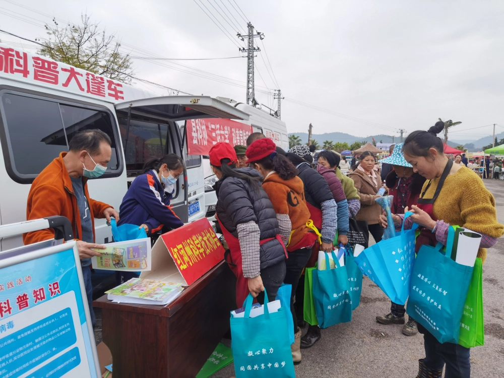 本次活动有现场义诊、法律咨询、农技服务、文艺汇演等项目。科普志愿者在现场发放宣传资料、布放科普展板、播放车载科普视频和宣传讲解科普知识。科普宣传内容涵盖生态环保、应急避险、健康生活、种养殖技术等方面知识,吸引了大量群众驻足观看了解。