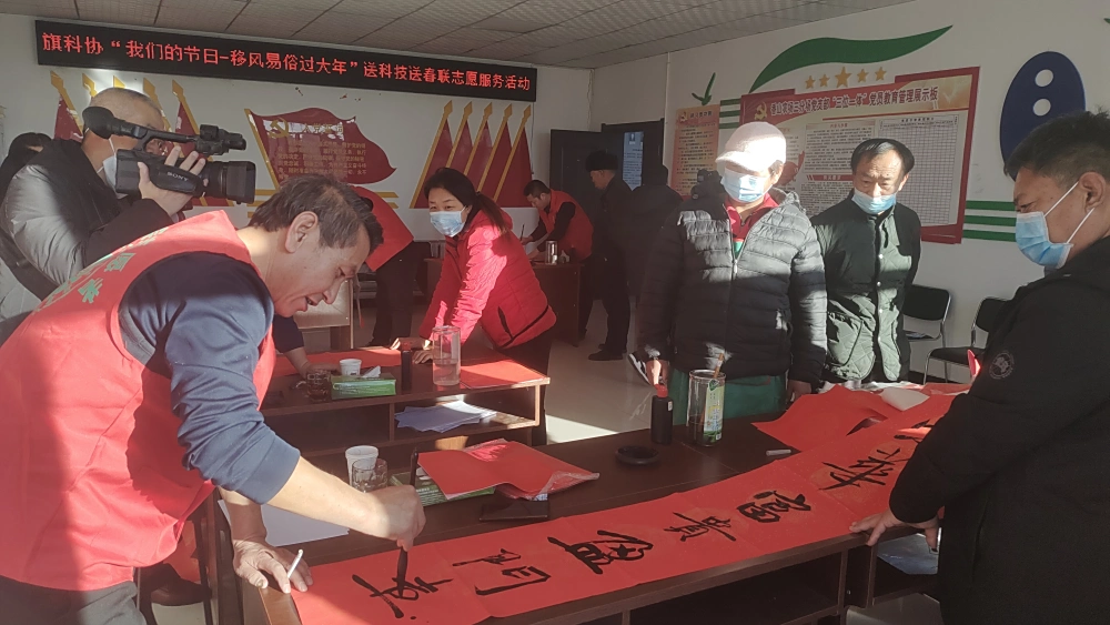 活动由旗科协联合旗图书馆联合举办,旗书法家协会蒙和、李彦文、苏雅拉等几位书法家们受邀现场泼墨挥毫书言为广大群众提前送上春节祝福,推动“我为群众办实事”实践活动走深走实。