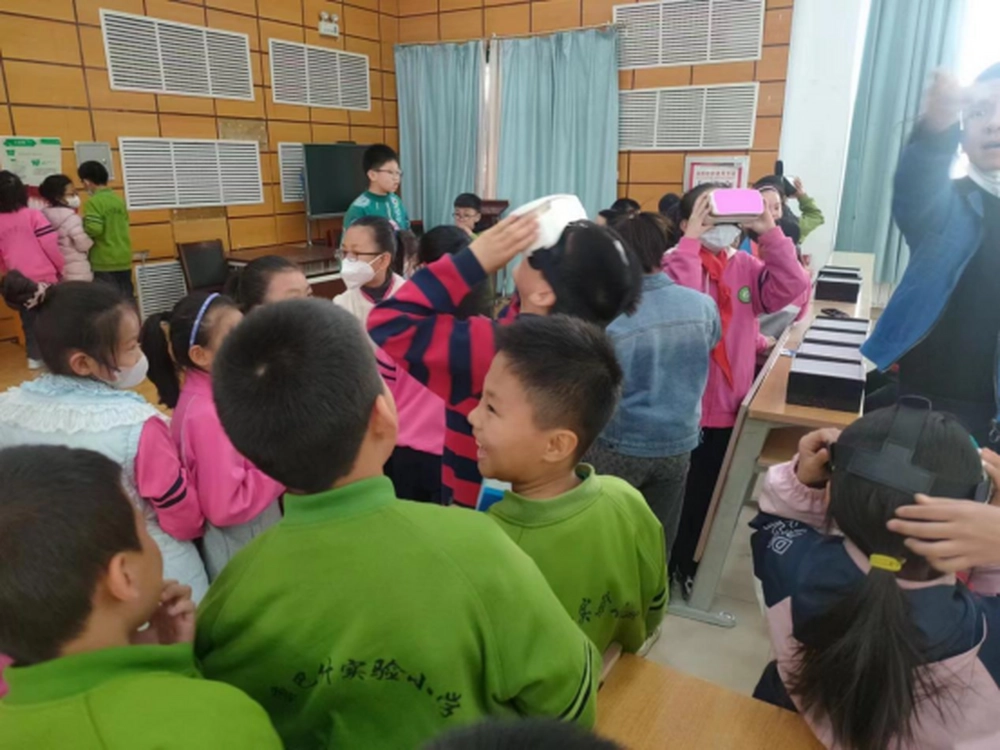 VR眼镜观看科普电影是最受欢迎的一个区域,恐龙的灭绝、沙漠之旅等影片受到同学们的喜爱。