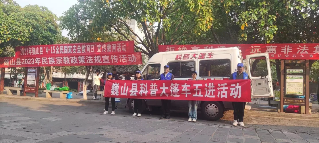 2023年4月14日,云南省巍山县科协到巍山县南诏镇蒙化广场开展科普大篷车“五进”活动。一是开展科普宣传活动,现场发放科普宣传材料,例如《反邪教基本知识折页》、《科普生活应急读本》、《健康咨询报价38问》、《大理州反邪教基本知识宣传手册》及科普宣传布袋等科普宣传资料。二是开展反邪教宣传及巡展活动。此次活动取得了很好预期效果,受到了当地群众的大力支持,也提升了全民科学素质。