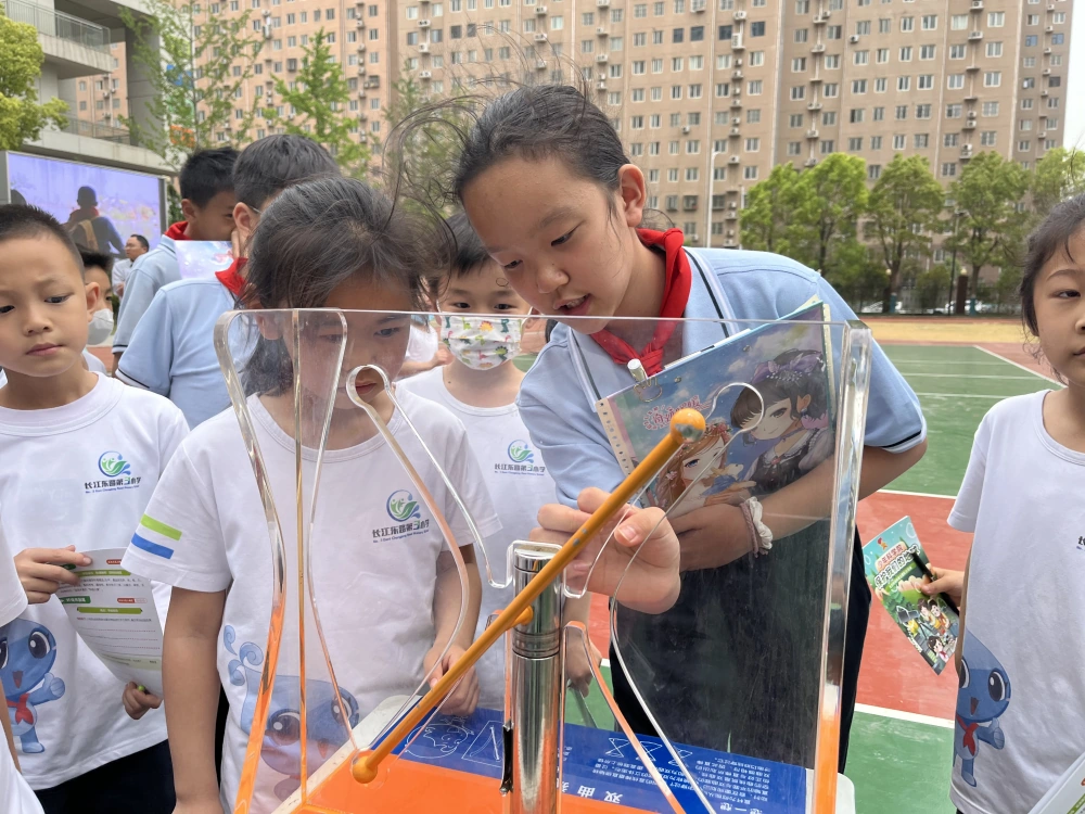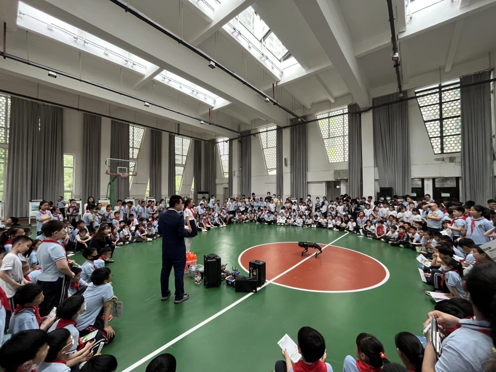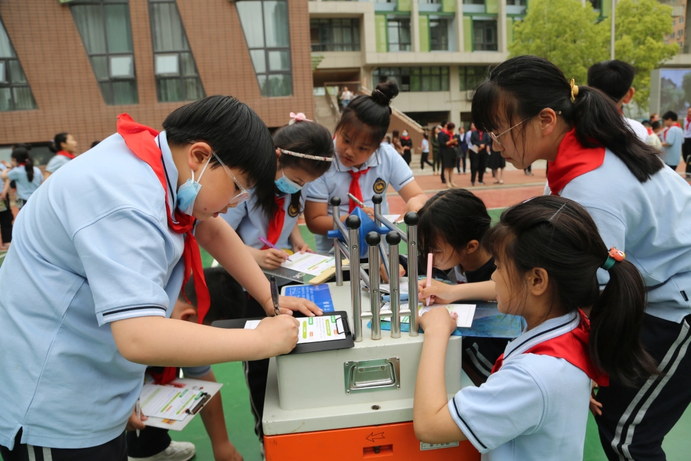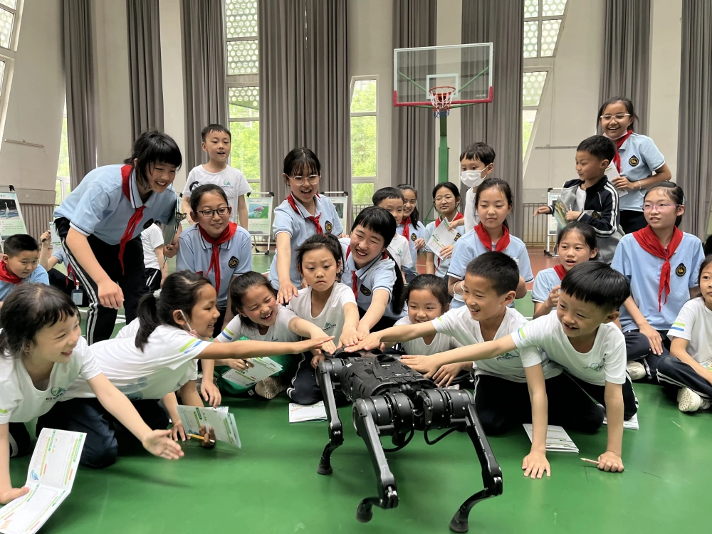 主题队会结束后,主持人宣布“少年科学院·保护我们的地球”争章打卡实践体验活动开始,2400余名师生按照班级顺序轮流在科普展品和《机器狗总动员》节目上进行打卡体验,同学们大呼过瘾。