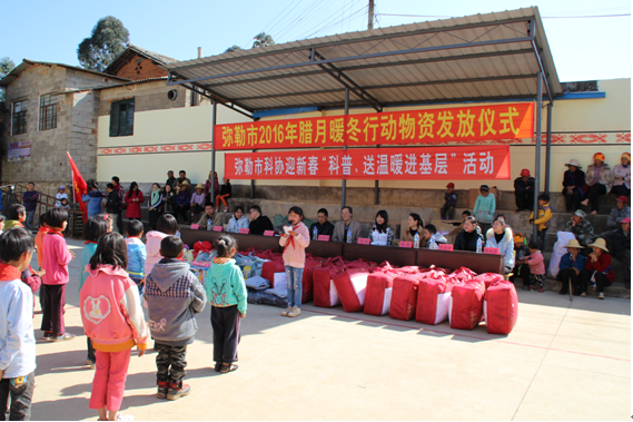 为深入推进扶贫攻坚“挂包帮”、“转走访”工作,落实中央,省、州群团工作会议精神,积极发挥群团部门联系广大人民群众的桥梁和纽带作用,1月29日,在新春来临之际,市科协联合市关工委、市总工会、团市委、市妇联等部门到五山乡开展“弥勒市2016年腊月暖冬行动物资发放仪式”。