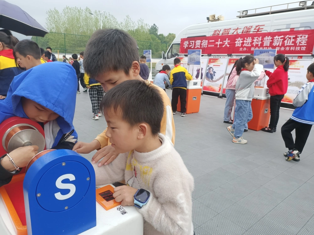 为深入学习贯彻党的二十大精神,进一步统一思想、凝聚共识,强化科普资源联动共享,推进现代科技的普及性、覆盖面,2023年4月13日,江西省新余市科技馆科普大篷车驶进分宜县洞村中心学校,将科普知识沉淀到乡村学校。活动有机器人、机器狗表演,20余件科普展品、科学家精神展板等,虽然天空下着雨,仍然挡不住孩子们对科普知识的渴望。此次活动,让孩子们近距离感受到了科普带来的魅力,通过动手操作、观看展板等,让孩子知道了其实科普就在身边。这次活动孩子们受益匪浅,并希望科普进校园的活动多多开展。