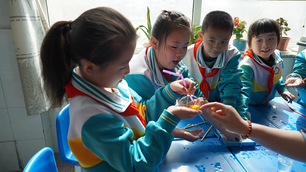 各类航天、禁毒、节能减排等的知识展板、会唱歌跳舞的机器人、机甲大师、无人机、VR眼镜、垃圾分类等科技展品一一展现在学生们眼前。每一位同学都对各类展品表现出极大的兴趣。随后科普辅导员在室内为他们带去了“水中立牙签”“戳不破的泡泡”“绕水走的火”等多种多样的科学小实验,让同学们亲自动手,在实验中体会科学的乐趣,当实验成功时,同学们是那么的兴奋。