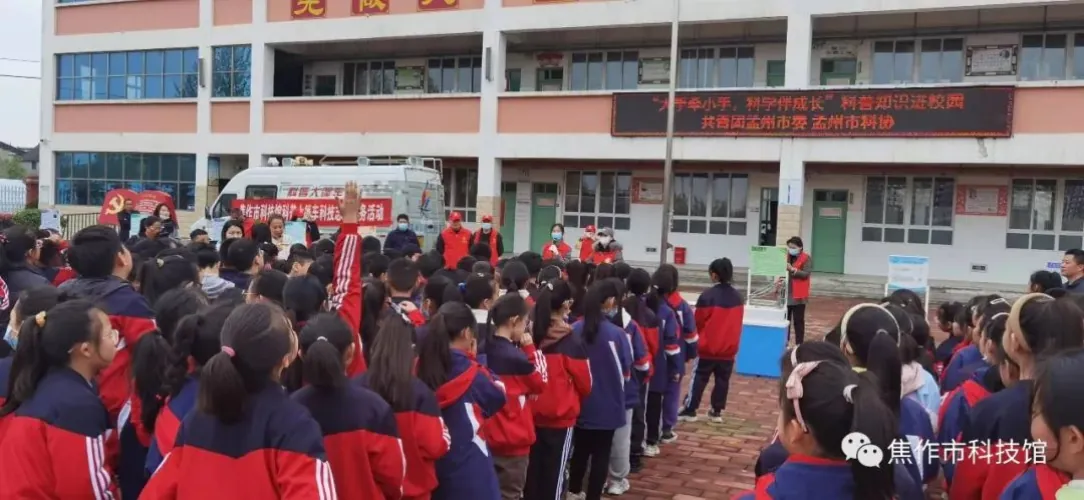 科普走进校园,探索科学奥秘。2023年4月4日,在焦作市科协的指导下,焦作市科技馆联合共青团孟州市委、孟州市科协开展了“大手牵小手 科学伴成长”科普知识进校园活动暨科普大篷车进校园活动,此次活动走进孟州市大定小学,旨在提高对科学知识的普及力度,培养、提高学生的创新意识和创造能力。