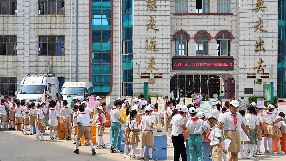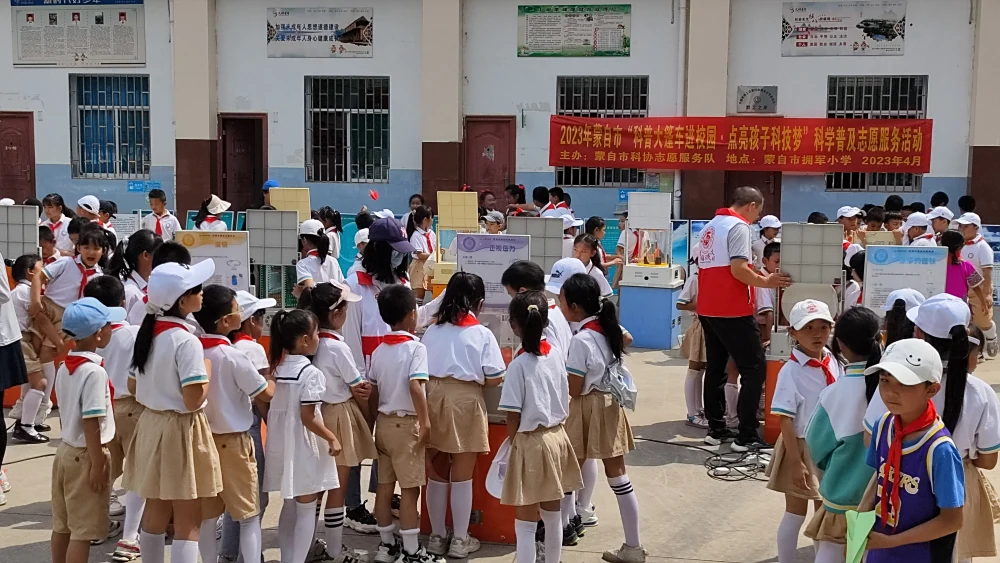 4月28日,红河州科协、蒙自市科协联合在蒙自市拥军小学开展2023年蒙自市“科普大篷车进校园·点亮孩子科技梦”科学普及志愿服务活动,共同助力蒙自市拥军小学第二届校园科技节活动,为全校师生送去了丰盛的“科普大餐”。