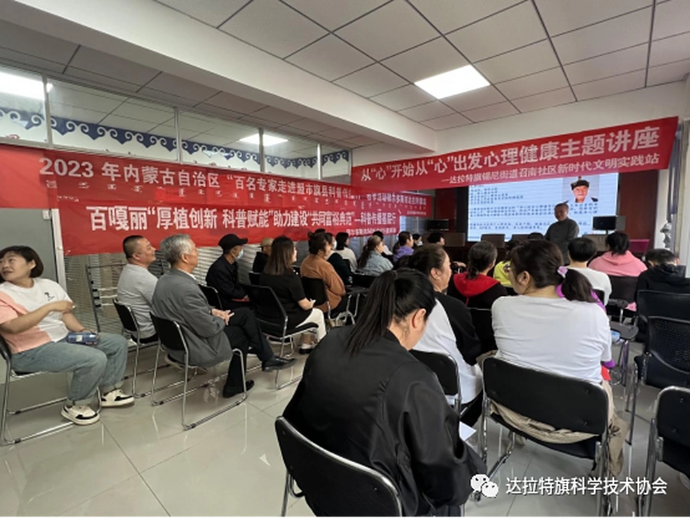 社区服务暖人心---2023年内蒙古自治区“百名专家走进盟市旗县科普传播行”春季活动鄂尔多斯市达拉特旗站走进召南社区,国家二级心理咨询师钱荣跃教授来到召南社区党群服务中心,为社区居民群众开展《从“心”开始从“心”出发》心理健康主题讲座。讲座中钱老师讲解了心理疾病与心理的关系,从【身心统合】角度,心理健康的基础知识,情绪管理与压力应对等方面,通过生动典型的案例深入浅出的讲述了怎样面对工作压力、心理压力,并与大家分享了健康心理的有效管理和自我调整方法,指导如何正确认识心理、认识情绪、学会掌控和调适情绪,从而养成积极乐观、健康向上的心态。在讲座结束后,钱老师为有需要的居民进行了一对一心理辅导,居民朋友纷纷表示很期待钱老师的下次科普讲座。