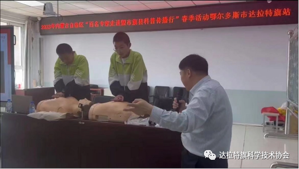 安全教育入校园---2023年内蒙古自治区“百名专家走进盟市旗县科普传播行”春季活动鄂尔多斯市达拉特旗站走进第八中学,特邀鄂尔多斯市红十字会四级调研员、内蒙古自治区应急救护核心师资、鄂尔多斯市红十字会急救护优秀讲师刘利锋,为增强学校师生面对突发事件和意外伤害的应急意识,让师生了解和学习应急救护的基本知识,提高自救和互救能力,开展《应急救护常识培训》讲座。刘老师用生动有趣的语言,真实的案例,采用了模拟现场的方式围绕防溺水事件、日常生活突发事件向学生介绍了紧急救护技巧、呼救和拨打报警电话技巧和遇到突发情况时自救和互救的方法,并在现场示范了心肺复苏基本技能等应急救助技巧。刘老师告诉大家,在事故发生的第一时间保持冷静,然后采取正确、有效的应急措施,最大限度的在医生和救护人员到来之前赢得挽救生命的黄金时间。