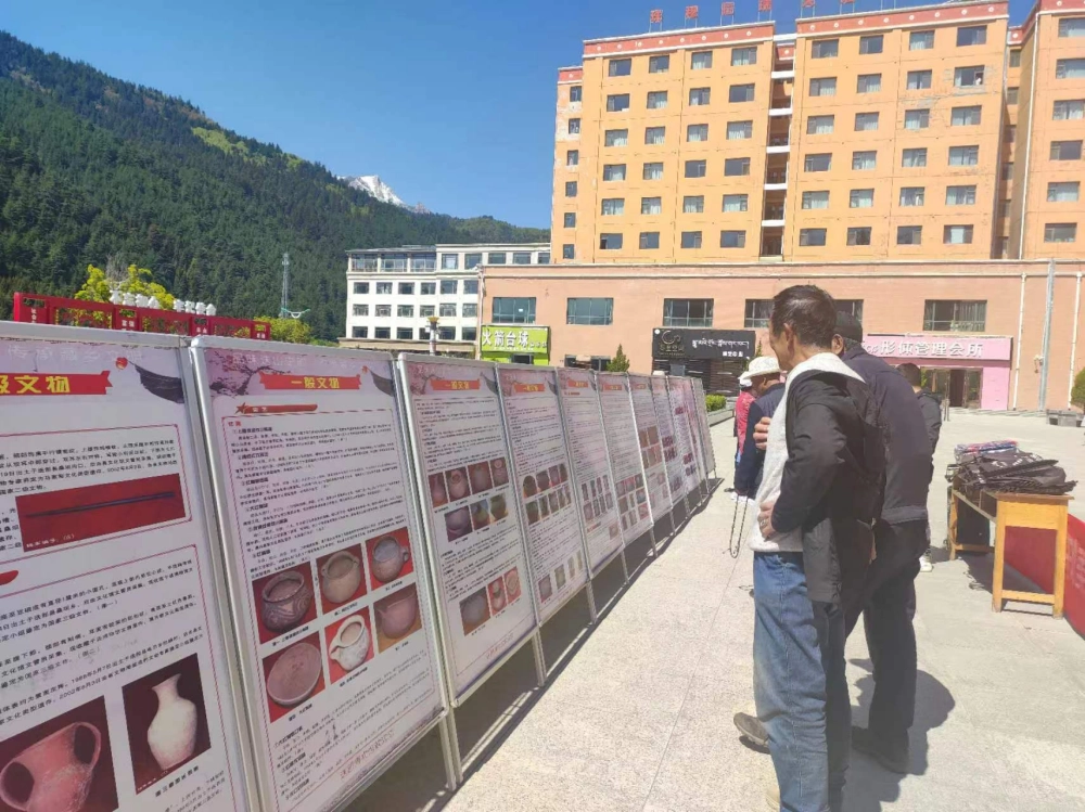 与科技展区的热闹相比,文化展区又是另一番光景,一排排整齐的展板展示着迭部县历史文化遗存、馆藏文物以及我县红色历史等内容。现场群众或聚精会神地倾听志愿者的讲解,或驻足观看展板内容,时不时与志愿者交流互动,沉浸式感受着迭部县历史文化和红色文化的魅力与意义。另外还设置了服务台,为现场的学生、群众进行详尽的科普讲解并发放宣传物品和资料。为大家带来了一场春风化雨般的历史文化知识滋养和革命精神洗礼。
