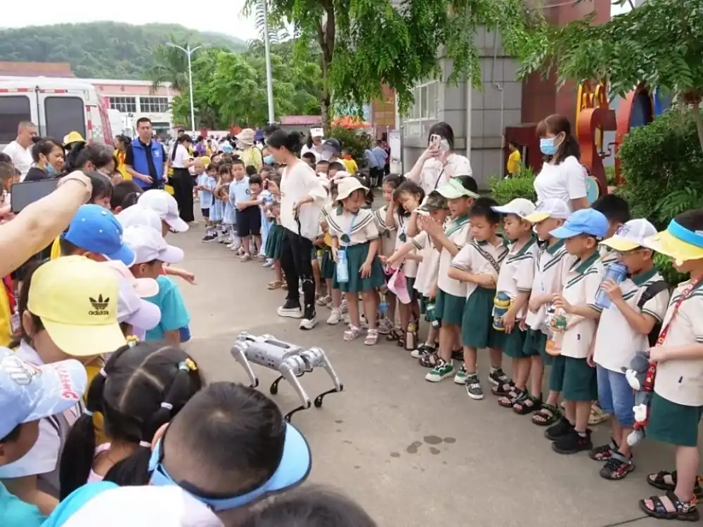 活动中,操场上摆满了琳琅满目的科普展教具,如伯努利星环、VR虚拟现实、机械伸缩花、跳舞机器人等,涵盖了力学、光学等基础学科。每个科普展教具前都围满了学生,大家好奇地按照提示动手实践,神奇的科学现象引发学生们的阵阵惊叹与欢呼声。工作人员还就科学原理向学生们进行详细地讲解,在轻松的氛围中,学生们也了解到了磁场、伯努利原理、转动惯量等科学知识。全场最受欢迎的莫过于仿生机器狗表演区,机器狗在遥控器的操纵下,一会儿摇头摆尾,一会儿就地翻滚,起身作揖的动作更是惹得现场欢笑声不断。来自河口县机关幼儿园的小朋友们忍不住伸出小手与机器狗“互动”,高年级学生则在工作人员的指导下亲自上手进行操作。