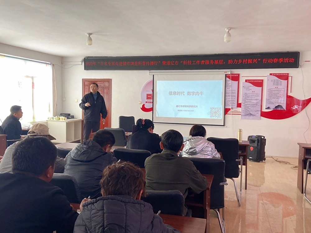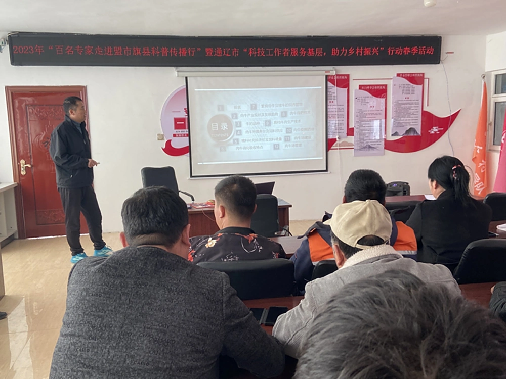 为宣传贯彻党的二十大精神,提升农牧民科学养殖水平,服务乡村振兴,3月11日,通辽市科协、市科技馆2023年“百名专家走进盟市旗县科普传播行”暨通辽市“科技工作者服务基层 助力乡村振兴” 行动春季活动走进开鲁县黑龙坝镇安乐村,养殖大户及群众共50余人参加培训。