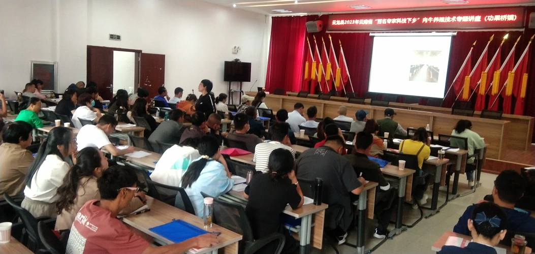 结合全县产业发展实际,为更好服务全县肉牛产业发展,结合“全国科技工作者日”活动,到诺邓、关坪、功果桥、长新、宝丰等七个乡镇开展肉牛养殖技术培训。培训邀请到云南省“百名专家科技下乡”宣讲团成员、云南省农业职业技术学院教授徐英老师,徐英老师从肉牛养殖的前景、圈舍建设、品种选择、常见病防治、饲料选择、日常饲养管理等方面作了通俗易懂的讲解,现场解答了参训学员的疑问,七个乡镇800多名党员群众参加了培训。