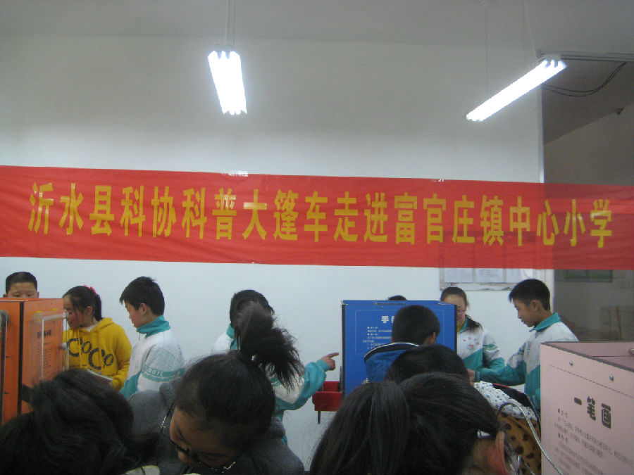 2016年3月7日,沂水县科协领导安排专职大篷车巡展人员,根据沂科协[2016]3号文件制定的活动方案,将大篷车展品从沂水县马站镇富龄完全小学,迁移到富官庄镇市场进行宣传,然后将展品放在富官庄镇中心小学,请学校老师集中组织学生进行体验。并请学校老师进行现场指导讲解,鼓励学生积极参与体验活动,同时开展了书写观后感活动,有效地促进了活动的深入开展,取得了较好的效果。