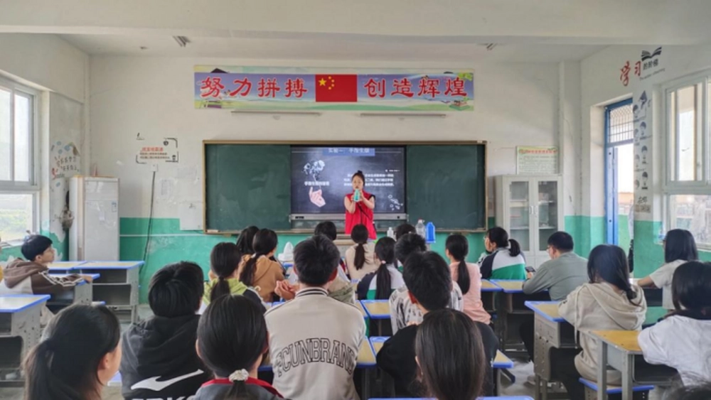 教室里,科普志愿者为学生们准备的科学实验秀“不一样的烟火”。“手指升烟”、“雾中烟花”、“盆中火”等科学实验将孩子们带入了一个奇妙的化学世界,让孩子们在充满趣味的实验中感受化学所带来的视觉震撼。