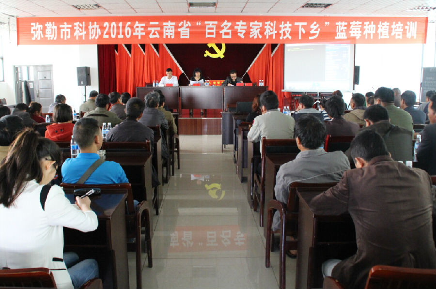 4月18日,由弥勒市科协组织的云南省“百名专家科技下乡”活动蓝莓种植培训在弥勒举行,为促进弥勒蓝莓产业的快速发展,培育新的支柱产业,全市相关科协专干、部分蓝莓种植大户、科普带头人、市科协全体干部职工共50余人参加学习培训。