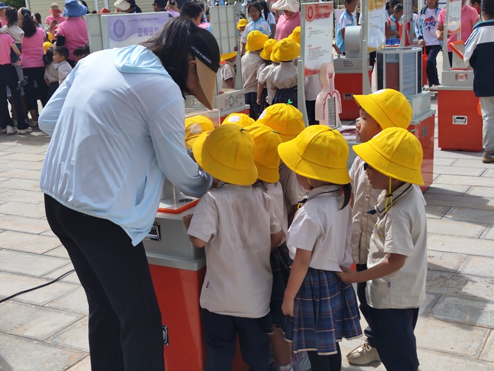 一排排科普展示台遍布校园,各种科学实验展台和展板整齐摆放,供同学们自由观看和操作,老师们现场解答疑惑,让学生在互动中学习科学知识,感受科技魅力。