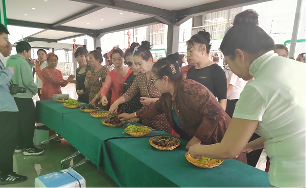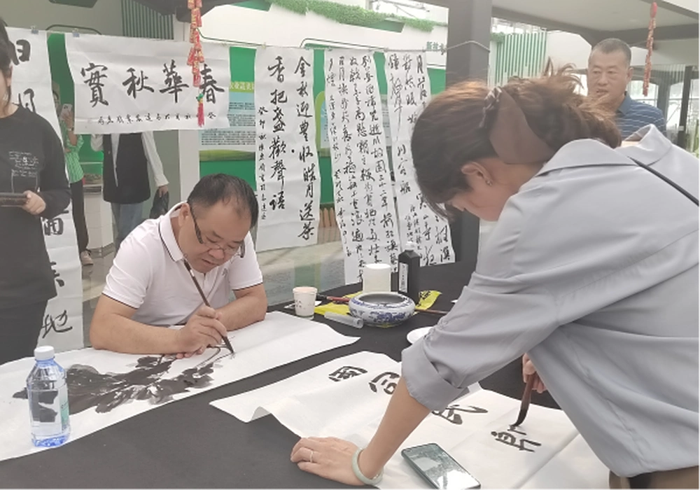 首先,科普志愿者组织农民种植户和居民群众,观看了丰富多彩的文艺表演。随后,志愿者一边带领大家品尝从“乌海葡萄科技小院”温室大棚现采摘来的美味葡萄,一边欣赏著名书法家、书画家带来的创作。活动现场,瓜果飘香,墨香四溢、乡土飘逸、丰富多样的书画作品跃然纸上,共庆丰收喜悦,像是在向观众传递着人们对美好生活的赞美,展现出新时代农民健康向上的精神面貌和共享和谐美好生活的幸福心声,把庆祝第六个“中国农民丰收节”活动推向高潮。