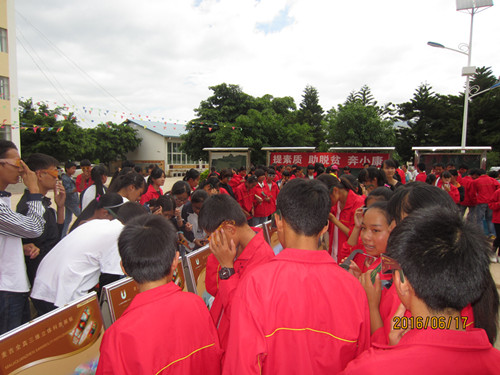 6月14-17日,由云南省科协、保山市科协、文山州科协、文山州砚山县科协联袂开展“科普大篷车”联合行动。14日上午,满载科普人热情和希望的保山市、砚山县两辆“科普大篷车”,克服了山路崎岖、道路泥泞等困难,顺利开进了座落在美丽的小凉山——丽江宁蒗彝族自治县大兴镇红旗社区红旗中学,这是一个由汉、彝、摩 梭、普米 、傈僳、 白族等多民族师生组成的民族团结大家庭。