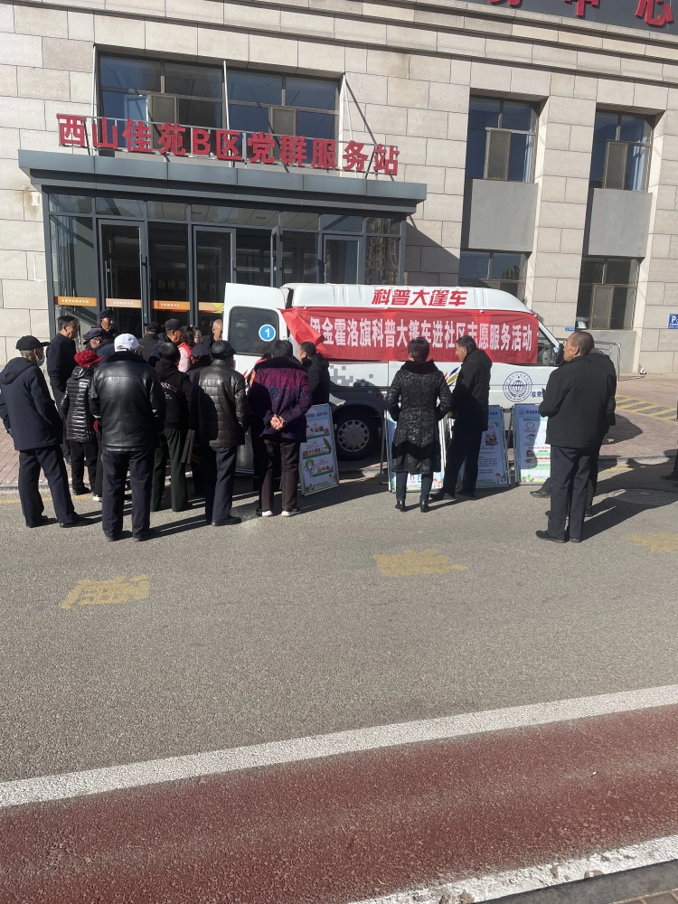 2023年11月24日,伊金霍洛旗科普大篷车走进西山佳苑社区开展科普志愿服务活动。活动现场,科协志愿者们通过展板展览、农科技术咨询、现场接受技术指导等形式,向广大农牧民宣传科普知识。此外,活动过程中通过发放资料、悬挂横幅等方式进行科普宣传,提高群众的科学素养。