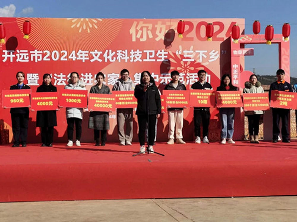 1月30日,2024年开远市文化科技卫生“三下乡”暨“法律进农家”集中示范活动在中和营镇启动,42家单位及200余名志愿者参与本次活动。