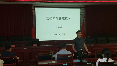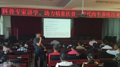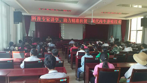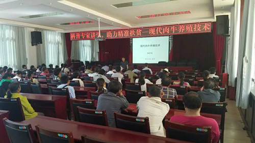8月18日上午,在漾濞彝族自治县漾江镇,云南农业大学动物科技学院教授刘学洪,为来自肉牛养殖较多的七村120余户建档立卡户及养牛大户进行“现代肉牛养殖技术”专题讲座,助力该镇精准扶贫。