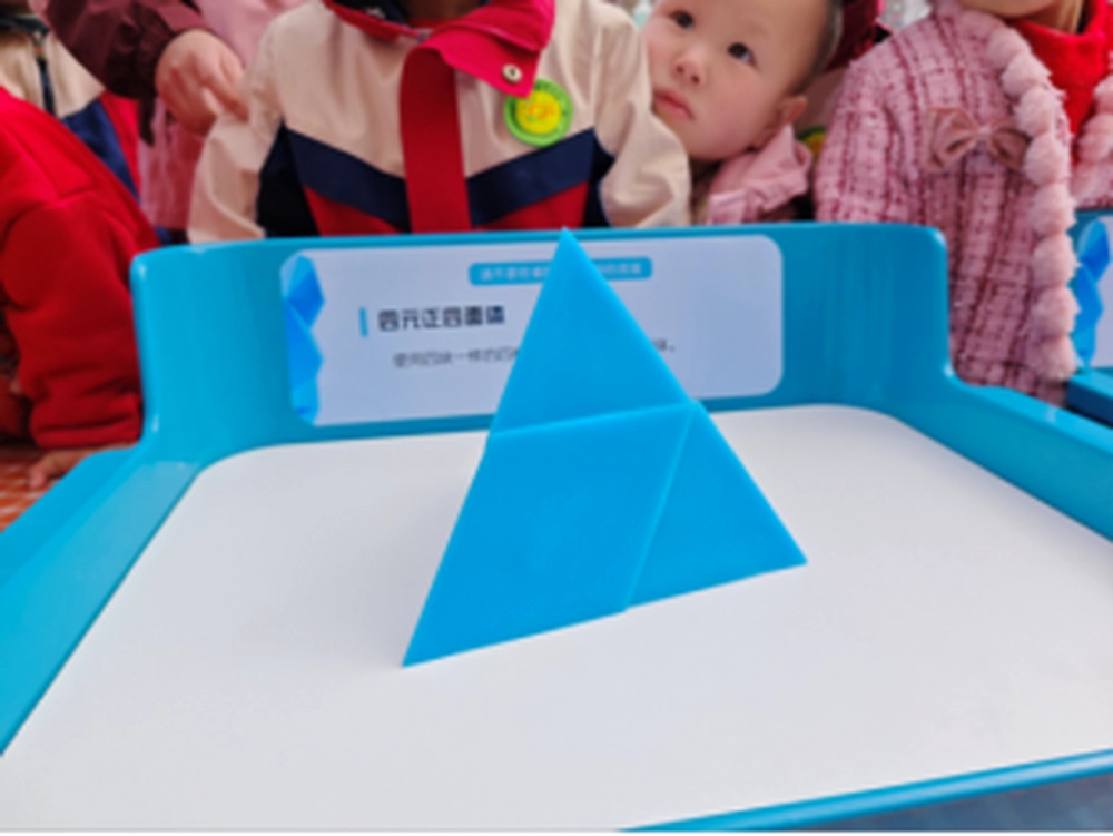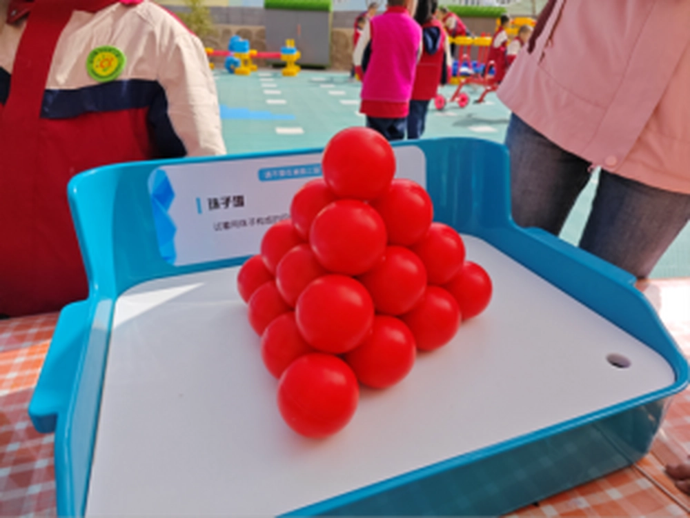 看,小朋友们在思考怎样才能拼好呢?好像是有点难度。不过没关系,老师和孩子一起来想办法。在师幼的共同努力下,拼成功了珠子塔和正四面体,以及其他智慧拼装展品。