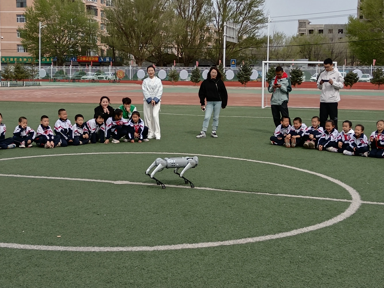 我馆还为同学们带来了一场精彩的机器狗表演,学生们围坐在操场中央,看着科普辅导员操纵手中的遥控器,机器狗便开始与学生们进行互动、表演、让学生们过足了“科技瘾”。