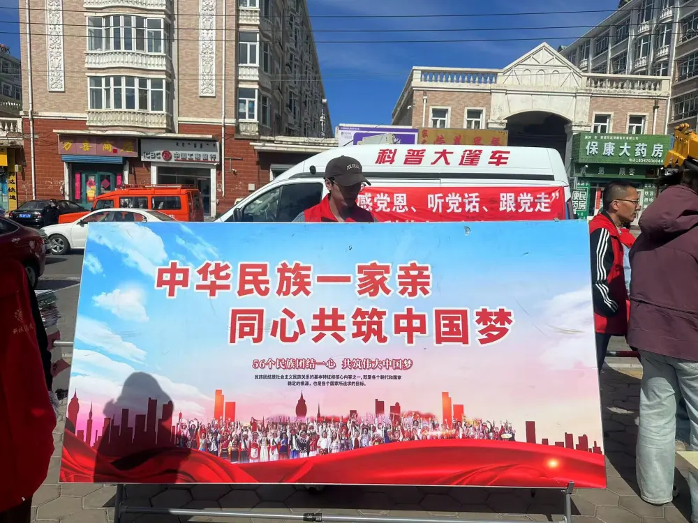 活动中,科普工作者利用科普大篷车深入广场开展铸牢中华民族共同体意识宣传教育活动,向群众宣讲党的民族政策,普及民族团结进步知识,发放宣传单、《内蒙古自治区促进民族团结进步条例》等宣传资料,号召大家在中华民族大家庭中像石榴籽一样紧紧抱在一起。