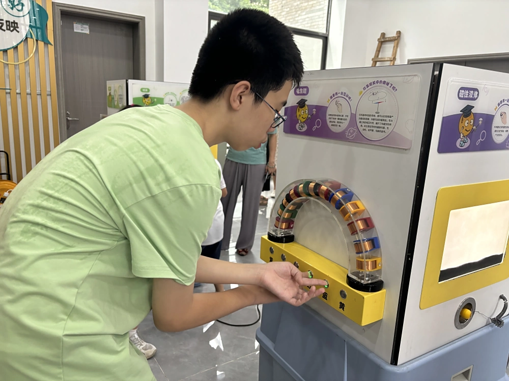 工作人员提前布好场地,在现场摆满了大大小小充满科技元素的机器和设备,涉及数学、声学、光学、电学、磁学等20余件展品,琳琅满目的令人目不暇接,为孩子们打造了一个奇妙的科学世界。巡展活动开始后,志愿者们细致地为居民朋友们解说展品和实验的科学原理,其中就解答了我们熟知的喊泉、手眼协调、电影原理等现象,揭开了奇妙的面纱。孩子们有序参观,认真学习与观察,并与家长进行互动交流。一旦碰到感兴趣的展品,还会停留驻足观看,对一些可触摸、可操作的展品排队模拟实践,亲身探索未知奥秘。社区居民表示说“这个活动很有意义,平时想要让孩子多接触科学,但是很不方便,这次直接将科普送到了家门口”。