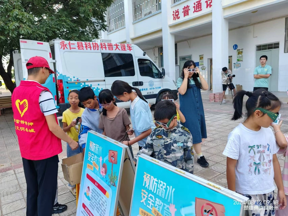 2024年8月13日上午,永仁县科协一行3人到永仁县宜就镇中心小学,利用流动科普大篷车开展科普宣传志愿服务活动。此次科普大篷车进校园开展科普宣传志愿服务活动,共向师生展出科普知识展具24件,预防交通安全知识、预防暑期溺水知识展板12件。县科协向留守学生、教师发放《应急科普知识》《崇尚科学.反对邪教》《普法进万家》《科普知识读本》《暑期防溺水》《科普乡村行》《科普趣味小读本》《公民科学素质知识400问》等各种科普宣传手册820余份,科协自制手提袋130多条,受益师生近130余人。
