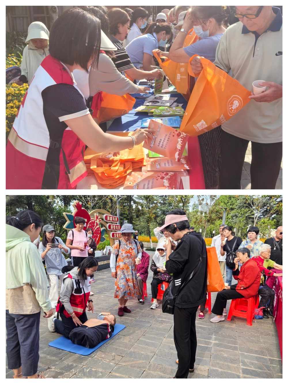 活动现场,科普志愿者以及医护志愿者们通过发放各类科普宣传资料、悬挂横幅和现场展示急救知识等方式,向过往群众普及急救知识的重要性。同时,专业急救人员进行了现场演示,详细讲解心肺复苏、止血包扎、AED急救设备的操作方法、海姆立克急救法等常用急救技能的操作要点,并邀请群众亲自参与实践,手把手指导操作,确保大家掌握正确的急救方法。