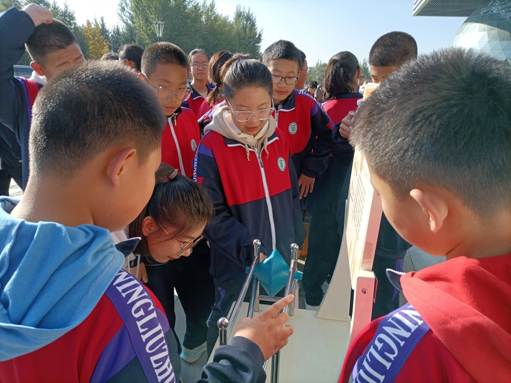 本次活动采用科普展品和展板相结合的形式,以科普大篷车为载体,各类科普展品依次排开,包括看谁跑得快、锥体上滚、最速降线、磁力传动摆、天鹅绒触觉……这些互动展品涵盖了声、光、电、磁等各类学科知识,让原本枯燥的科学知识,以更直观的形式展现在学生眼前,活动现场,气氛热烈,醒目的科普宣传条幅和新奇的科普展品吸引了学生们的围观,大家围在展品前积极讨论,我馆的科普辅导员穿梭在学生中,用通俗易懂的语言为大家讲解展品的操作方法以及包含的科学原理,大家认真聆听,仔细观察展品所展现的科学现象,亲自动手体验科技神奇的魅力。
