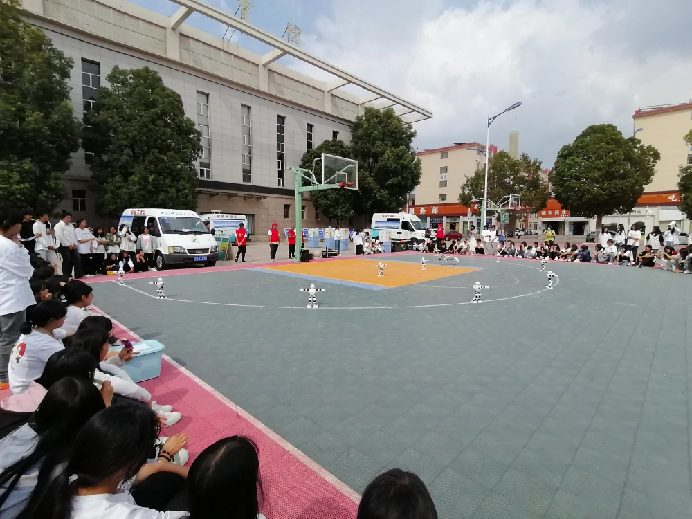 科普大篷车联合巡展第二站活动以一曲激动人心的音乐拉开了序幕,在娓娓动听的音乐声中,十台机器人缓缓晃动起了身体,随着音乐的旋律开始舞蹈。伴随着机器狗的招手,摇头摆尾以及跳跃翻转,引来了一声更比一声高的惊叹声。在场的各位同学连连尖叫,对机器人的表演兴致颇高,纷纷拿出手机录像、拍照,只想保留下这一幕珍贵的镜头!