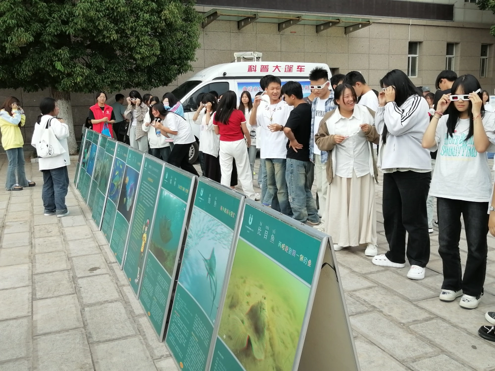 除此之外,还有一些同学流连于3D海底世界展板上,争先恐后的去科普讲解员手里接过3D眼镜,排队有序的去参观海底世界的展板,在惊叹于3D世界的逼真之外还对海洋生物有了进一步的了解。观察细致入微,发问也直击重点。