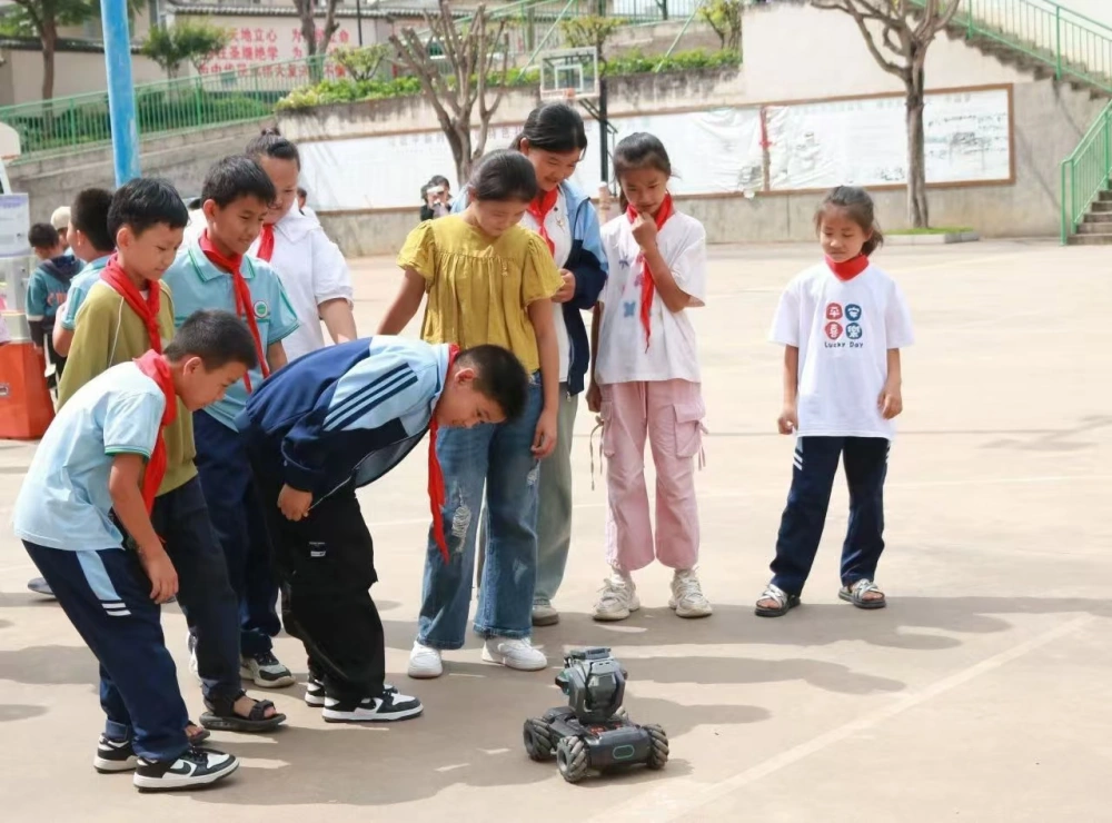 活动现场展品琳琅满目,包括智能机器人、机器传动、机械狗、电磁材料以及视觉体验等,吸引了众多学生围观。在科技志愿者引导下,亲手操作展品,探索数学、光学、力学等科学原理;师生共同观赏智能机器人舞蹈,感受人工智能魅力,现场气氛热烈,欢声笑语不断。同时,活动还融入民族政策宣传教育,弘扬民族团结理念,鼓励学生们争当民族团结的倡导者与实践者。