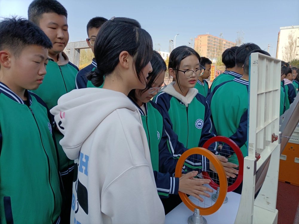 本次活动采用科普展品和宣传展板相结合的形式,我馆利用科普大篷车将各类科普展品带到学校,包括锥体上滚、磁力传动摆、最速降线、天鹅绒触觉……这些互动展品涵盖了声、光、电、磁等各类学科知识,让学生们在玩中学、学中玩,将枯燥的科学知识以更直观的形式展现在大家面前。活动现场,醒目的科普宣传条幅和新奇的科普展品吸引了学生们前来观看,我馆的科普辅导员穿梭在学生中,用通俗易懂的语言为大家讲解展品的操作方法以及包含的科学原理,大家认真聆听展品的操作方法,仔细观察展品反映的科学现象,亲自动手体验科学的神奇之处。