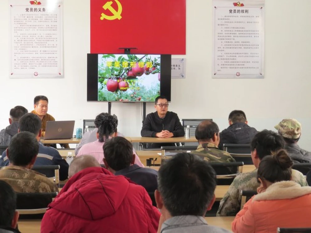此次培训会以理论讲解和现场实操的方式进行,参与培训的农户共有50多户,60余人参加,其中包括村干部、脱贫户、监测户和其他种植户。专业技术人员针对苹果种植管理的关键环节,包括品种选择、土壤改良、施肥浇水、病虫害防治、苹果套袋、修枝整形等方面,进行了深入浅出的讲解,并现场解答了种植户们提出的各类问题。此外培训人员还对苹果套种中药材、苹果套种蔬菜等相关套种技术作了详细的讲解。理论讲解结束后,授课老师又到果园给农户现场演示讲解了果树修枝整形相关实用技术。参与培训的农户们热情高涨,认真聆听、记录,积极与技术人员互动交流。大家纷纷表示,此次培训内容实用、针对性强,为他们的苹果种植和苹果套种提供了科学的指导和有力的技术支持。