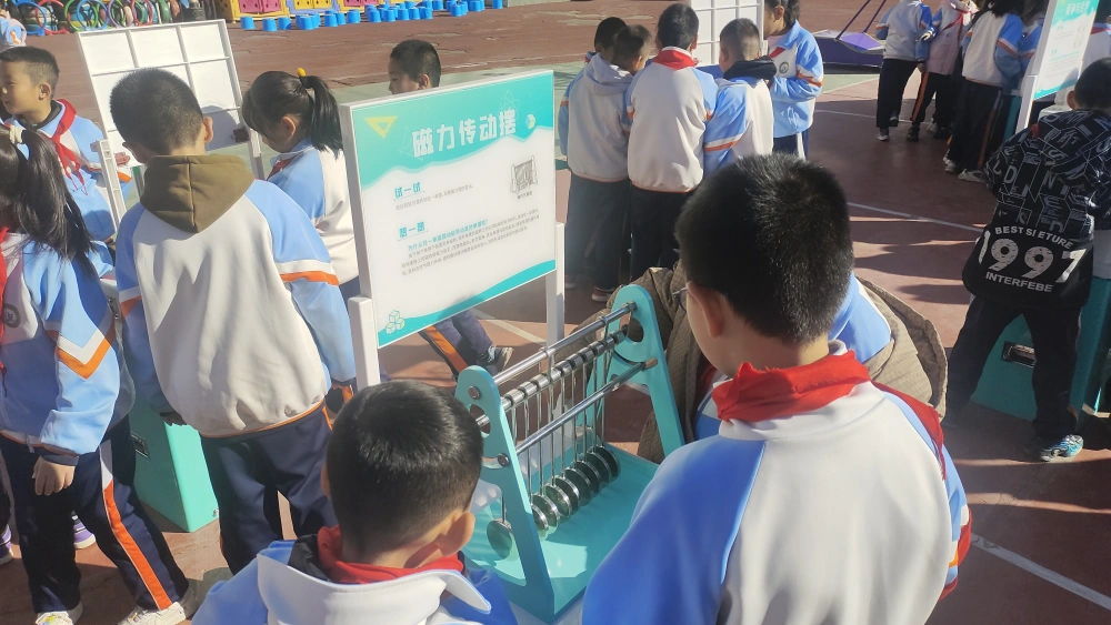 10月21日上午,市科协科普大篷车丰富的科普展品在校园科技节亮相,为1500多名学生带来了一场科普盛宴。活动现场,犹如一个璀璨夺目的科技乐园,洋溢着探索与发现的喜悦,丰富多彩的科技表演深深吸引着同学们,“无弦琴”、“异形齿轮”、“手摇发电”等各类科普展品,不仅涵盖了空气动力、力与机械、电磁奥秘等基础科学知识,更为同学们带来了多样化的科技互动体验。同学们兴致勃勃地穿梭于各个展台之间,积极地观察、热烈地讨论、勇敢地尝试……在零距离的接触中,亲身感受科学世界的无限神奇,探索着其中的奥秘与精彩。科普志愿者们耐心细致的讲解,让同学们知道了科学现象背后的知识,点燃了小小少年的科技梦。通过“看、玩、摸、试”亲身体验科技的神奇与魅力,不仅为学生们提供了一个近距离接触科学、感受科学魅力的机会,更是科普教育的一次生动实践。