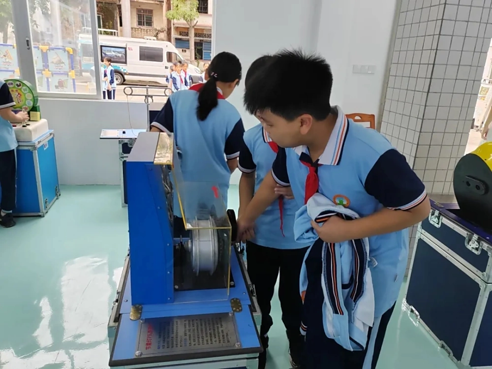 在展厅工作人员的引导下,同学们有序地参与到各个展品的互动体验中。