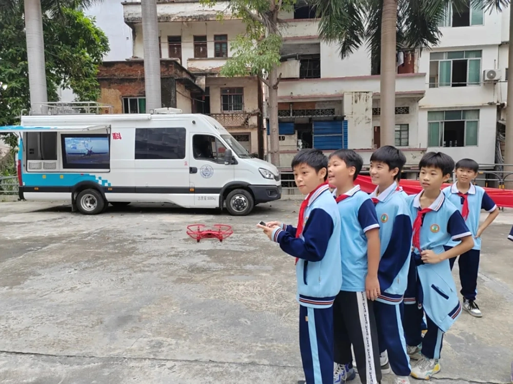 在“无人机”体验区,同学们手握遥控器,体验无人机的起飞、降落、悬停、转向等基本操作。