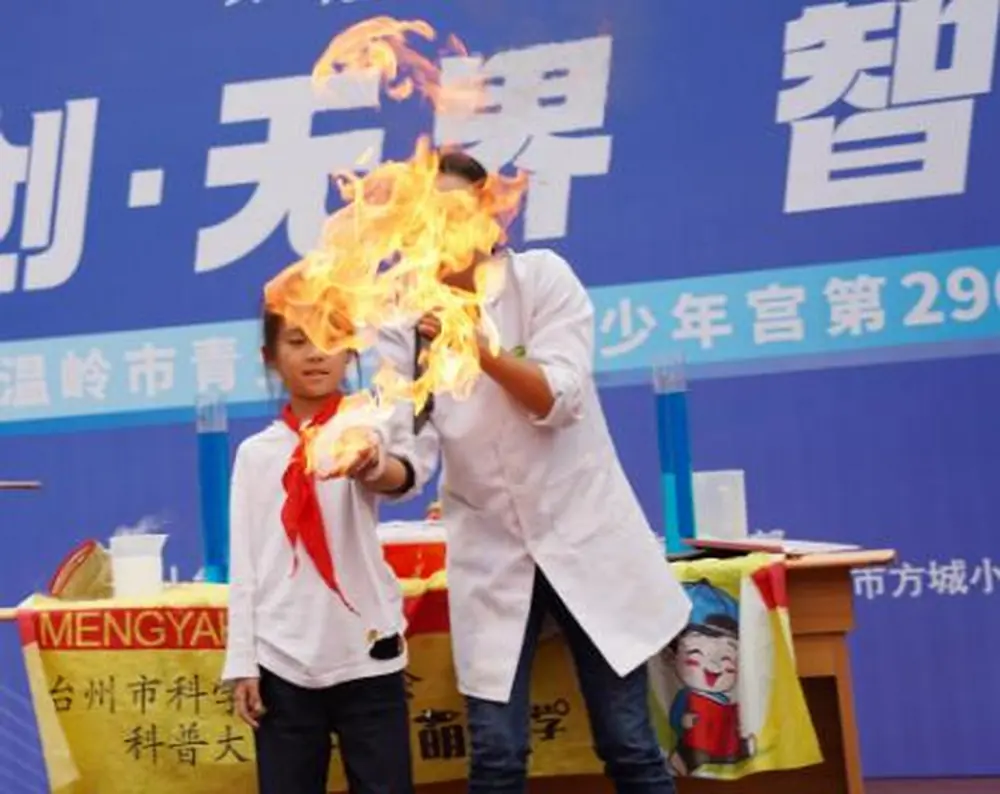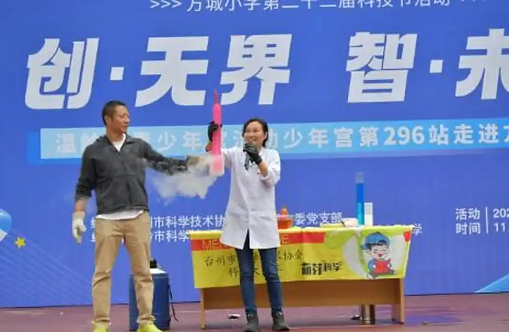 “看!老师手上‘着火了’……”开幕式上,温岭市科协工作人员为大家带来了一场精彩绝伦的液氮实验秀。炫酷的“手捧烟火”、神奇的“液氮气球”让同学们看得目瞪口呆,冒烟的液氮零食、一飞冲天的液氮火箭更是让他们好奇心爆棚。